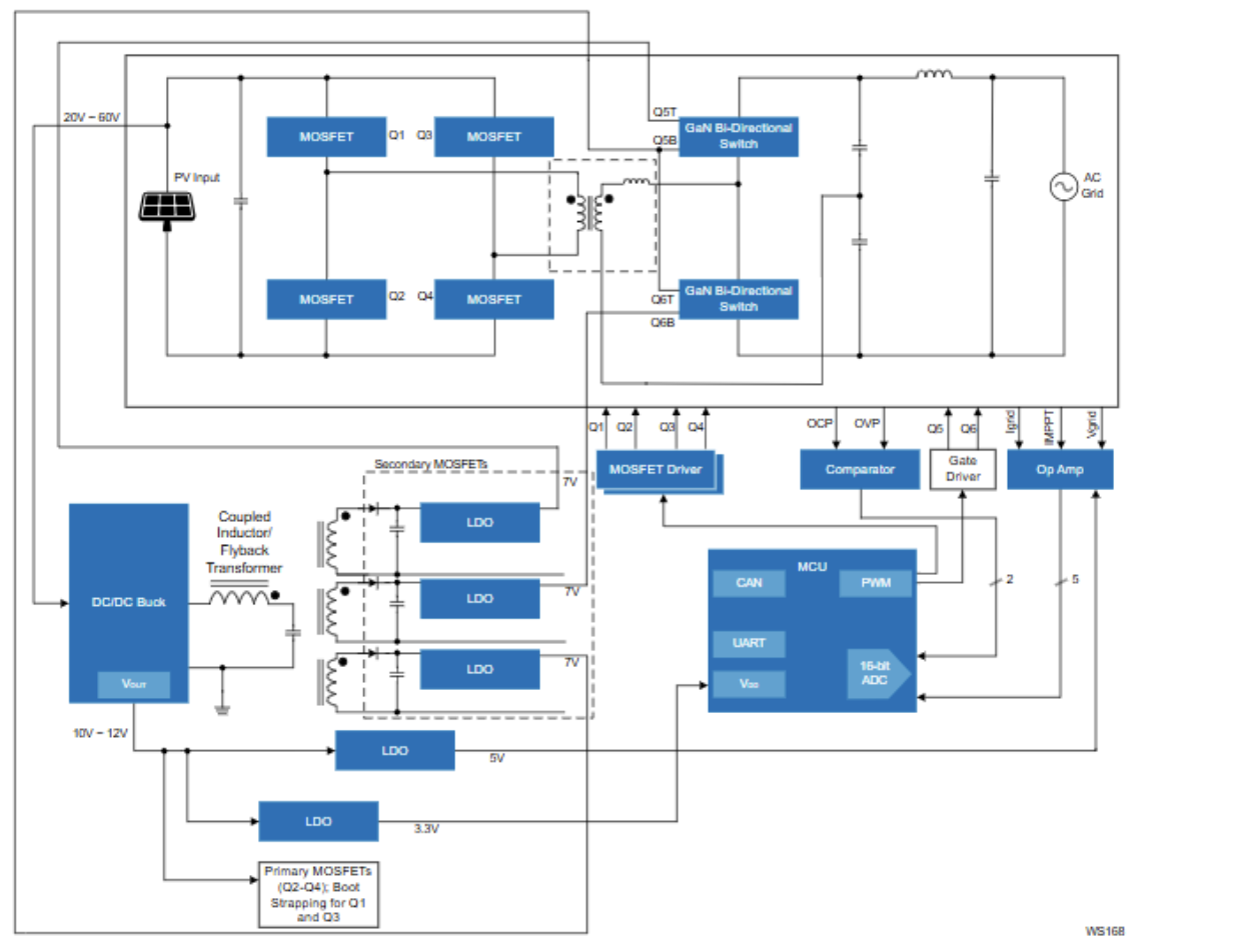 This inverter features an Arm® Cortex® MCU to run the MPPT algorithms while providing power flow control and real-time monitoring. Conventional flyback-based microinverters are limited to delivering 250 watts and require multiple switching stages, which bring about more switching capacitances and on-state resistance. But this GaN bidirectional switch achieves a higher power output with fewer devices, better efficiency, a higher power density, and a smaller overall PCB design.