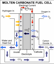 A Molten-Carbonate fuel cell uses a suspension of high-temp salt mixtures in inert ceramic-matrix composites for electrolysis. The operating temperature of 650 degrees Centigrade (around 1.2 thousand degrees Fahrenheit) makes it possible to use a non-noble metal on both positive and negative electrodes for a catalytic reaction. This allows to reduce costs significantly. The average electric power efficiency of such a cell is 45-50 percent. This figure may be boosted up to 85 percent if the qualitative byproduct heat is captured and used for driving turbines or in other cogeneration technologies.