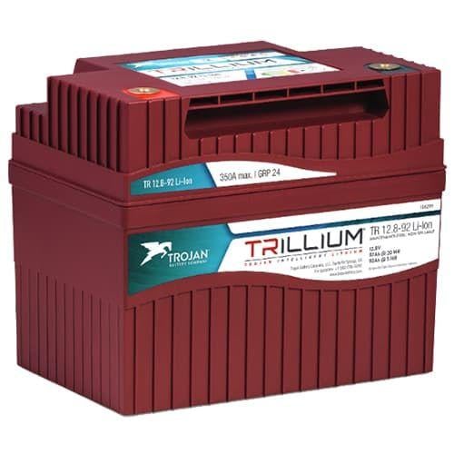 Trillium is the latest battery model from the Trojan Battery Company that uses the deep cycle Lithium-Iron Phosphate technology. By using deep-cycle Lithium-Iron Phosphate instead of nickel or cobalt technology, the battery attempts to improve the average lifespan and the safety of the battery while at the same time increasing its output range. The expected lifespan of this model is higher than 5,000 cycles and has a reserve capacity of 220 minutes. It has a maximum capacity of 12.8 volts and can produce a maximum output of 1.4 kW.